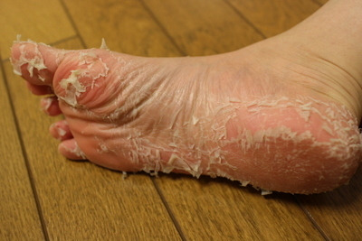 #【写真】料理長がダイコンを洗ったタワシで足の裏を洗う様子