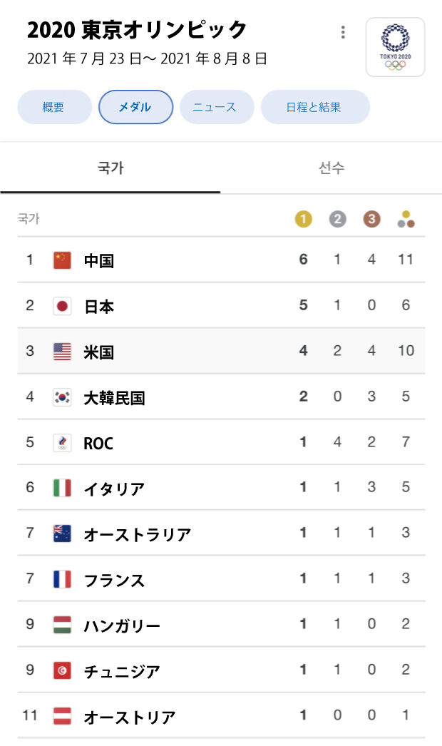 金メダル=日本5 > 韓国2>>1