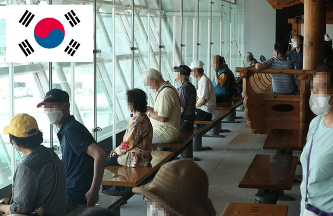 韓国の高齢者、涼しい空港でバカンス