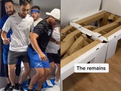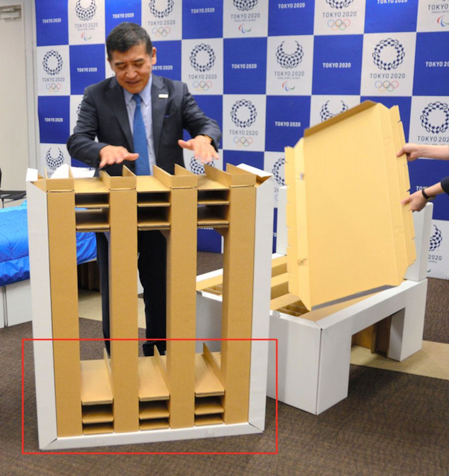 東京五輪:「性関係防止用」と茶化された段ボールベッド、9人乗ってジャンプするとぐしゃり