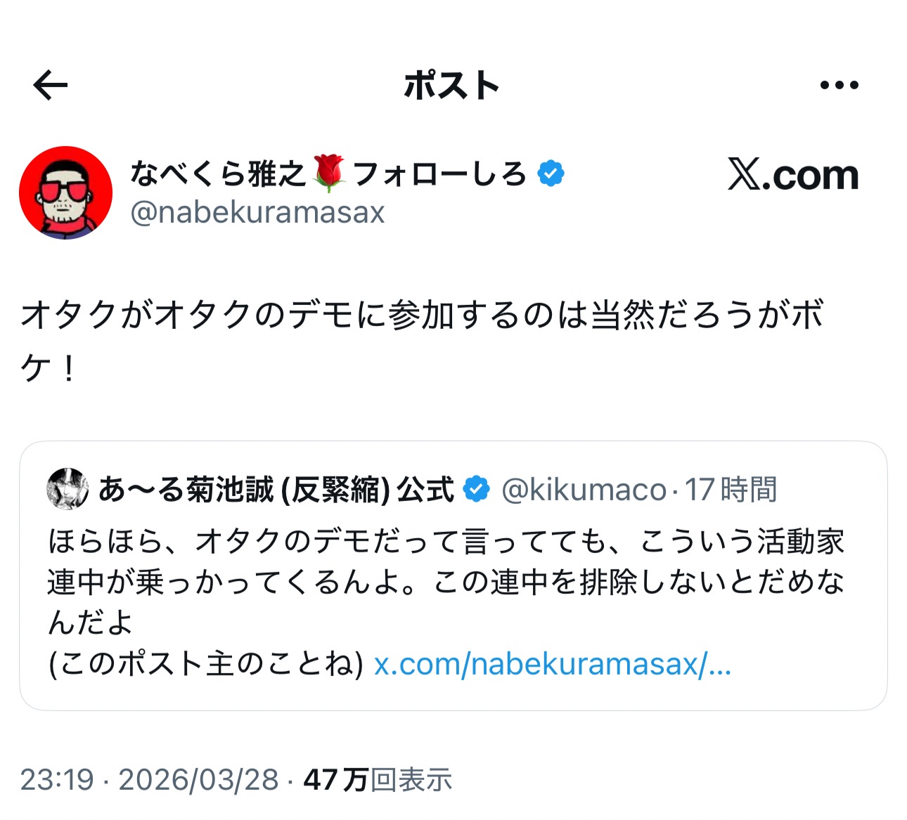 オタクデモの主催者さん、妻が共産党支持者で義父が共産党員と過去投稿でバレるw