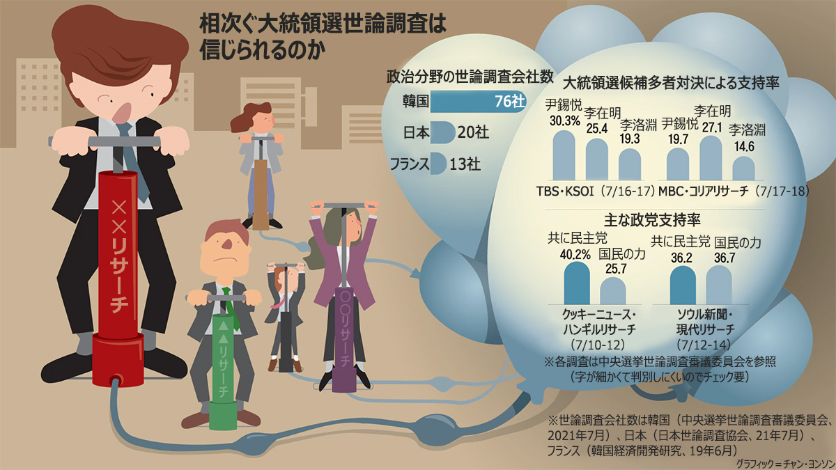 一部世論調査で特定の候補と政党の支持率に10ポイント以上の差が出ているほか、短期間に傾向が著しく変動していることが分かった。本紙は7月22日、最近10日間に中央選挙世論調査審議委員会に登録された大統領選世論調査18件を分析した結果だ。専門家は「調査結果が会社ごとに異なり、同じ会社の結果も変動する」と述べた。7月初めから22日までの3週間に公表された大統領選世論調査だけで40件に達し、世論調査の乱発現象も目立っている。5年前、大統領選7カ月前に当たる2016年9月に公表された大統領選世論調査が13件比べ3倍に増えた格好だ。