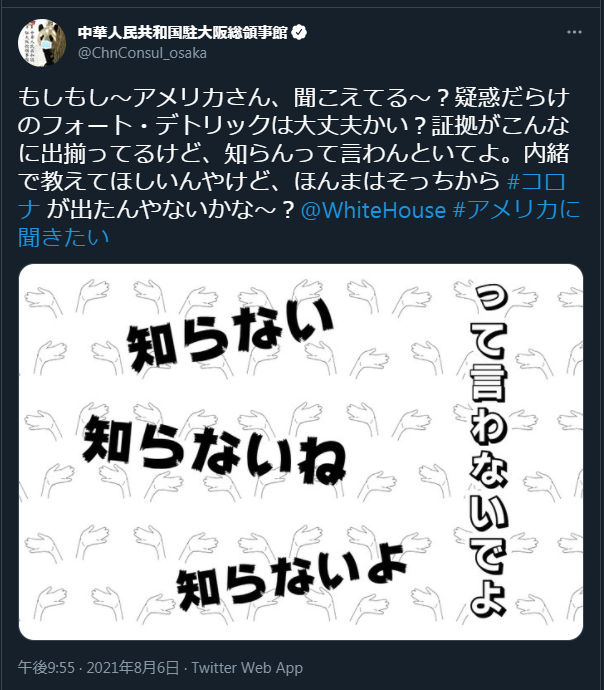 何故か在日中国大阪領事館がアメリカに向けて日本語で挑発ツイート