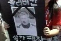 試合後、ハングルで書かれた遺影を「日本人の仕業」と吹聴笑うわ!