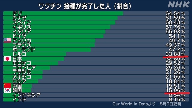 韓国のワクチン接種完了者の割合はOECD最低で日本の約半分である。