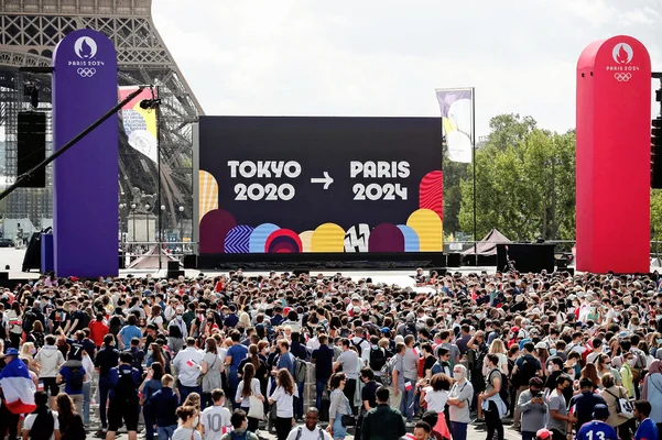 2024年に次回の夏季五輪を開催するフランス・パリでは8日、エッフェル塔前のパブリックビューイング(PV)会場に6000人の上限を超える人が詰め掛け、入場待ちの列ができた。