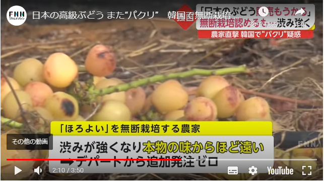 農家に直撃取材をするとあっさりとホロ酔いを無断で栽培したことを認め、「以前シャインマスカットがヒットしたので次の日本の品種を探していた。韓国の農家は日本のように匠の精神はない」と話している。