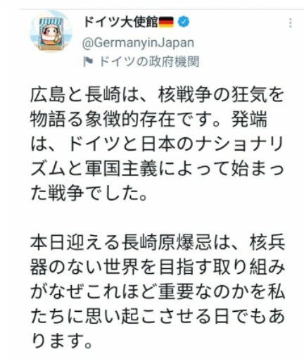 続けて、「広島と長崎は核戦争の狂気を物語る象徴的存在です」であるとし、「発端はドイツと日本のナショナリズムと軍国主義によって始まった戦争だった」という趣旨の投稿をした