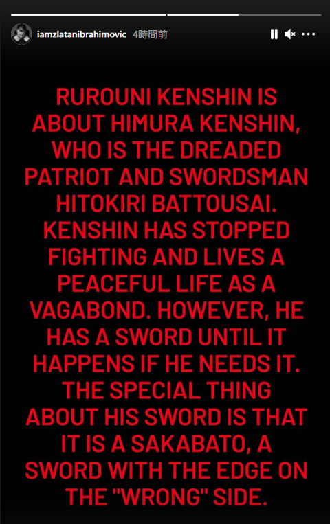 ミランのFWズラタン・イブラヒモビッチが12日、インスタグラム(@iamzlatanibrahimovic)を更新。ジャンプ漫画『るろうに剣心』を解説している。
