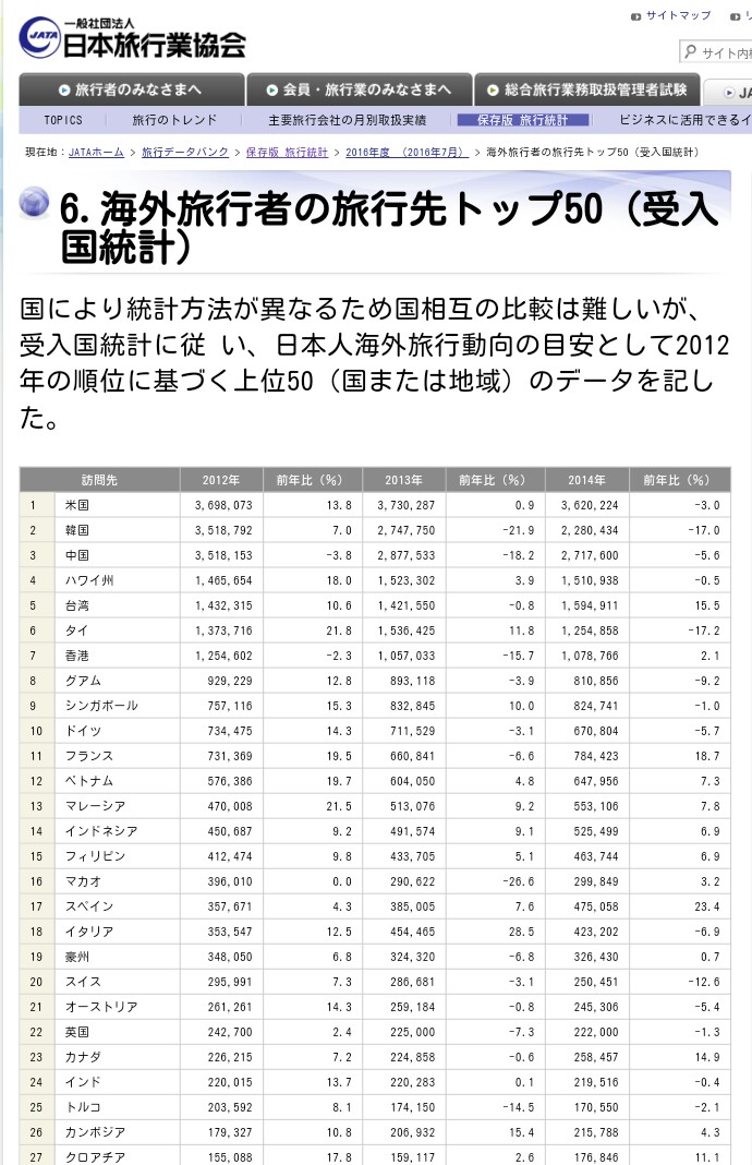 海外旅行者の旅行先トップ50(受入国統計)https://www.jata-net.or.jp/data/stats/2016/06.html