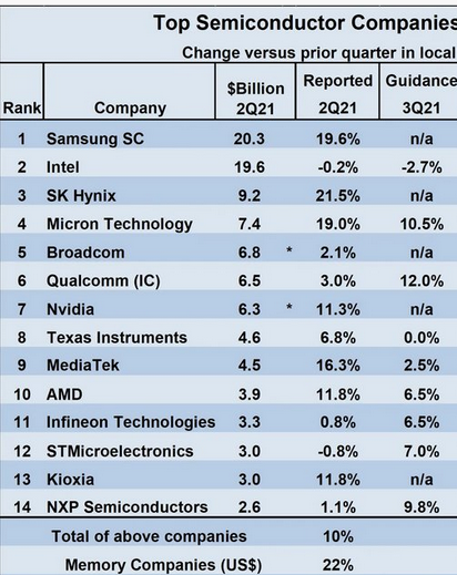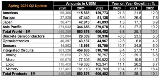 18일 업계에 따르면 세계반도체시장통계기구(WSTS)는 최근 발표한 보고서를 통해 올해 반도체 시장 성장률을 기존 19.7%에서 25.1%로 조정했다. WSTS는 지난 3월 올해 반도체 성장률을 10.9%를 제시했으나 지난 6월 19.7%로 한차례 상향했고 또 다시 이를 올린 것이다.