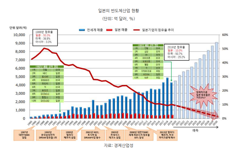 일본의 글로벌 반도체 시장점유율은 1980년대 전성기의 절반에서 10분의 1 수준으로 추락했다. 일본의 반도체 수입 의존도는 64.2%에 달한다.