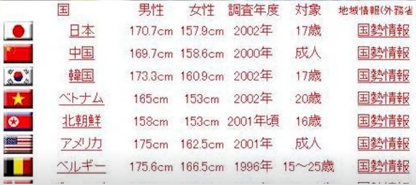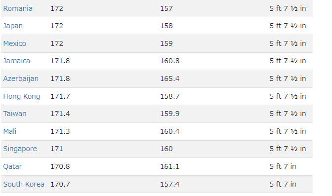 日本...男子(172cm)、女子(158cm)