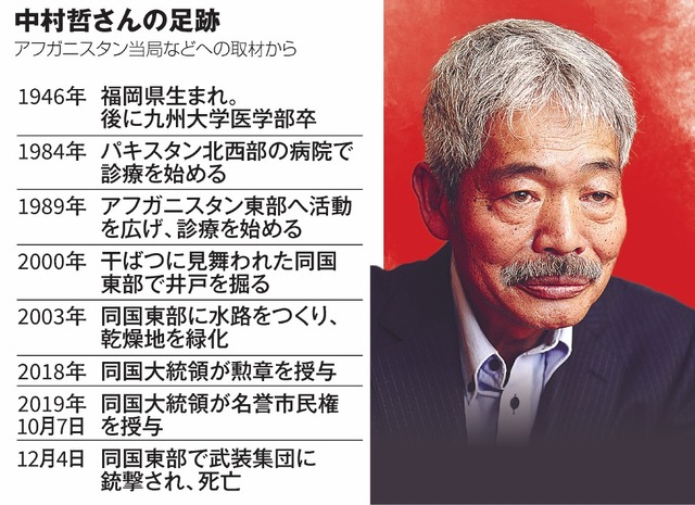 中村さんは事件の2カ月近く前の19年10月7日、アフガン大統領から名誉市民権を授与され、国民的英雄としてたたえられた。中村さんに注目が集まったことが、犯行のきっかけになった可能性がある。
