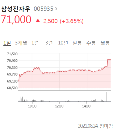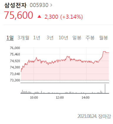.24일 장마감 기준 삼성전자는 전 거래일 보다 2300원(3.14%) 오른 7만5600원에 거래를 마쳤다. 이날 삼성전자 주가는 모건스탠리의 강력추천 선정 소식과 함께 삼성그룹의 대규모 투자 소식이 이끌었다.