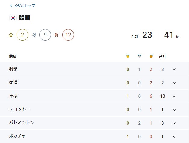 https://www.yomiuri.co.jp/olympic/paralympic2020/20210905-OYT1T50238/東京パラ:韓国は金2・銀10・銅12で総合41位…初参加の1968年大会以来最低