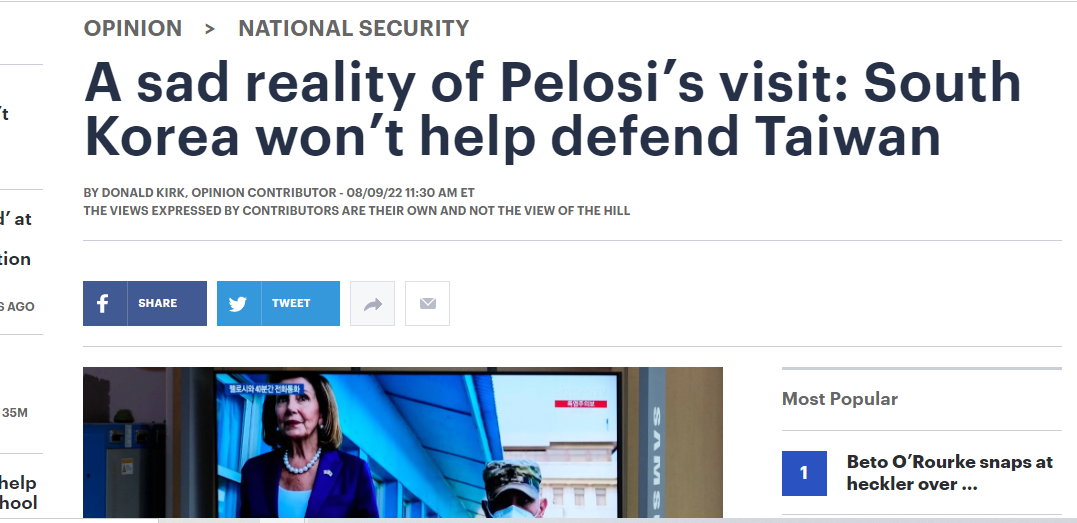 ナンシー·ペロシ下院議長(D-Calif.)のアジア訪問は、多くの人々が気付かなかった一つの現実を明らかにした。 台湾海峡で戦争が起これば、米国は同盟国である大韓民国の支援を当てにできない。