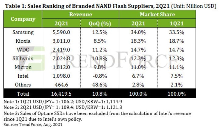 낸드플래시 부동의 1위인 삼성전자는 시장 점유율에서도 올해 1분기 33.5%에서 2분기 34.0%로 0.5% 포인트 늘었다.