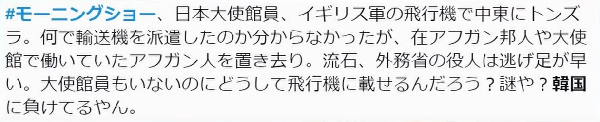 「日本人の退避は望まない」「日本人がアフガニスタンに留まることを望んでいる」「様々な企業で人道的支援をしている人たちには退避して欲しくない。彼らにはアフガニスタンに留まってほしい。安全は保障する」「アフガニスタンにいる日本人を我々は必要としており、退避して欲しくない」「日本人には、協力してほしい」「我々と日本とは長い間、良い関係がある。外交的にも非常に良い関係がある。だから、我々は日本人を保護する。彼らには、何ら問題は起こらないだろう」「しかし軍の駐留は好ましくない。日本の自衛隊は退去してほしい」「日本人には心配せずアフガニスタンにいてほしい」「日本人には、継続的な協力と支援を期待する。我々は、友好的であり続け、良い外交関係でいたい。これからもそのような良好な関係であるべきだ。そして、信頼関係と協力が欠かせない」