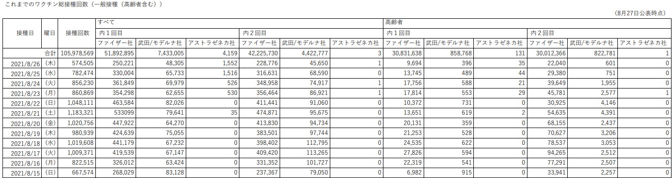 독약 백신 접종 사망자 10만명これまでのワクチン総接種回数(一般接種)8/27