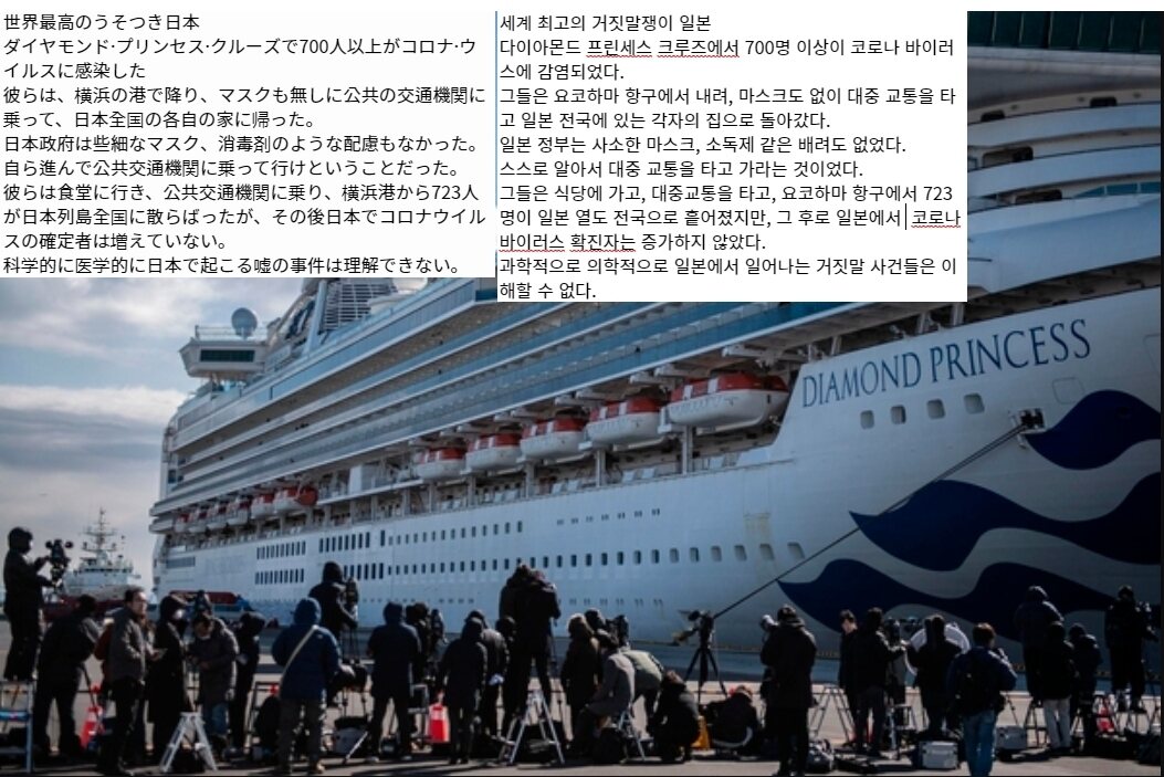 다이아몬드 프린세스 크루즈에서 코로나 바이러스에 감염된 732명이 마스크도 없이 대중교통을 타고 전국 열도로 흩어졌지만, 일본은 감염자가 발생하지 않았다.