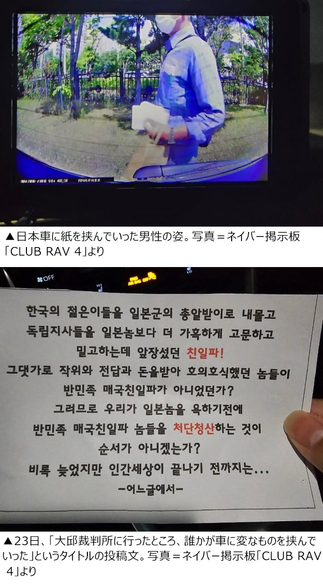 27日、トヨタ「RAV4」所有者が集まったオンラインカフェ「CLUB RAV 4」には23日、「大邱(テグ)裁判所に行ったところ、誰かが車に変なものを残した」という書き込みとともに車に残されたメッセージを写した1枚の写真が投稿された。