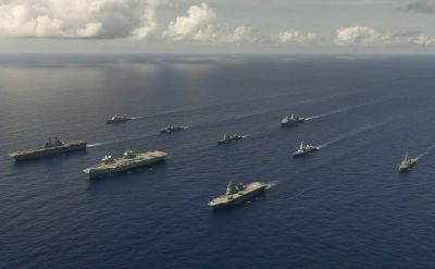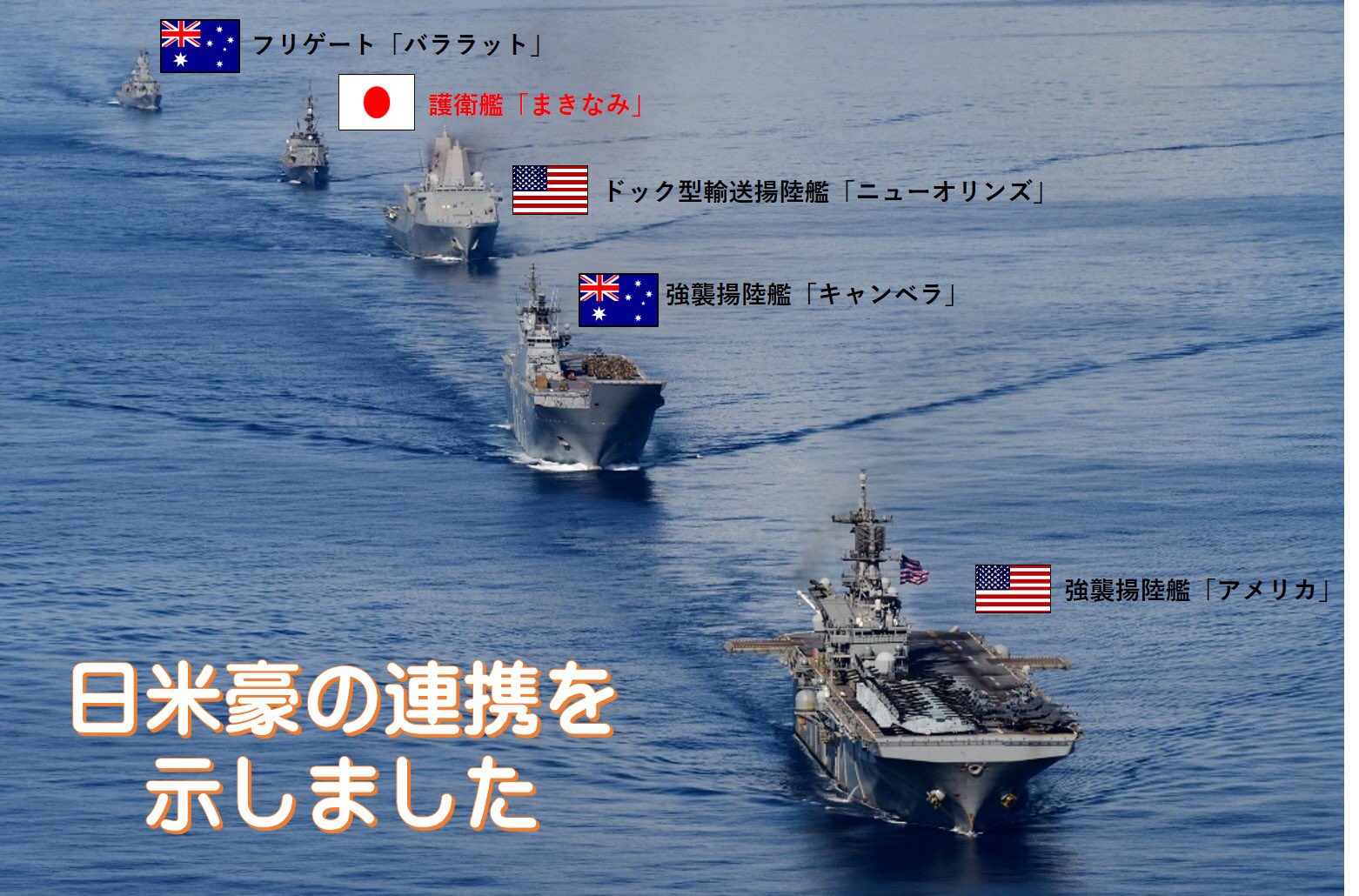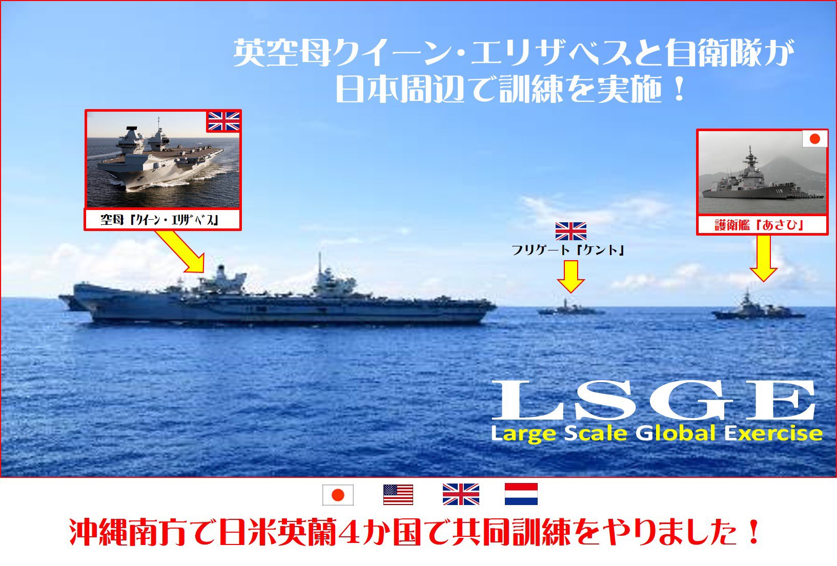 自衛隊は、英空母「クイーン・エリザベス」率いる英空母打撃群(CSG21)と日本周辺で訓練を行いました。写真は、8月24日に沖縄南方海空域で行われた「米国主催大規模広域訓練(#LSGE)」の後段部分で日米英蘭の4か国と共同訓練を行った時の様子です。