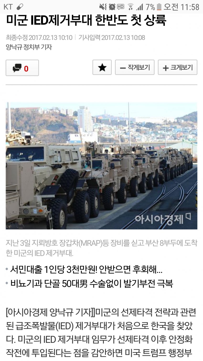 2名無し2017/02/13(Mon) 19:53:32ID:Q0NTg2MTU(1/1)NG報告이게 농담이 아닌게, 오늘 뉴스를 보니 IED 제거부대가 한국에 상륙했다고합니다.IED 제거부대는 보통 선제타격 후 안정화 작업에 투입된다는 점을 고려하면....음....>>50