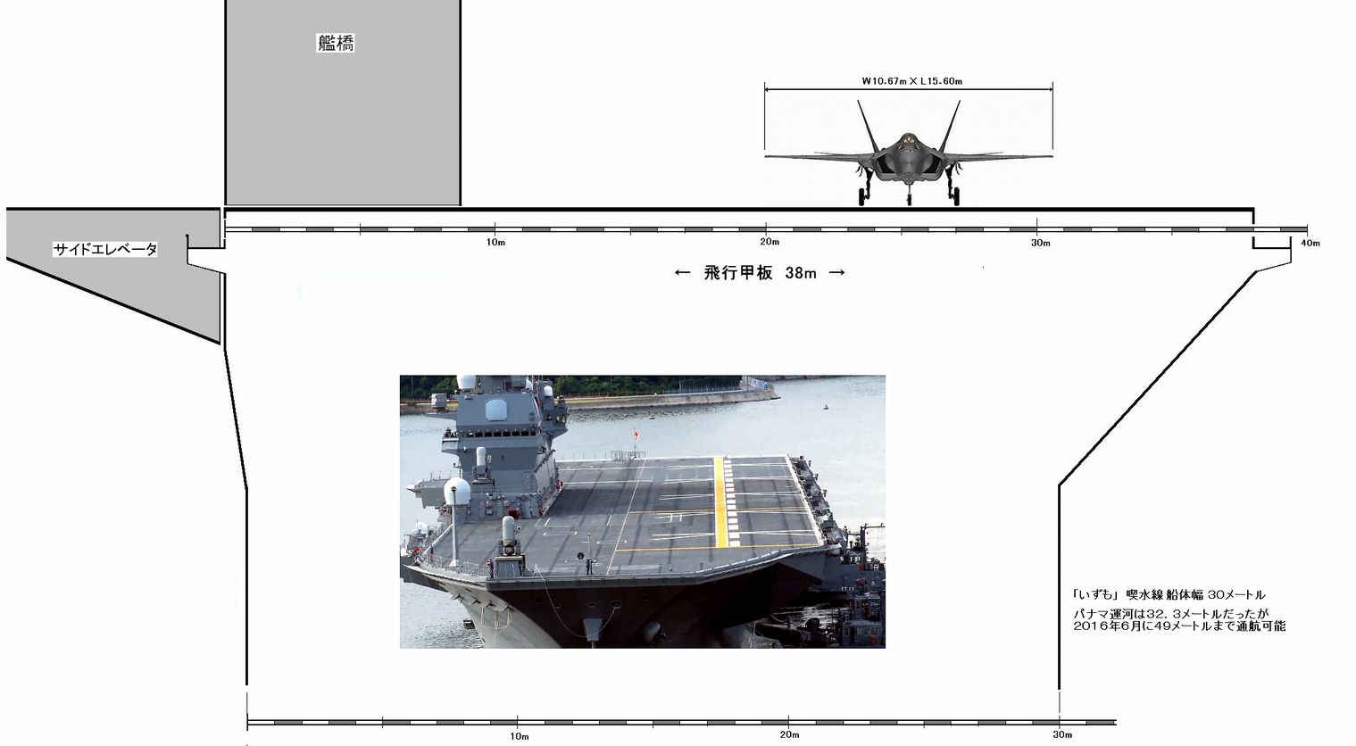 クイーンエリザベス空母からF35Bステルス機は滑走路を走り、甲板端部の「スキージャンプ台」を跳躍しながら離陸するが、出雲にはこのような跳躍台がなく、垂直に離陸しなければならない。