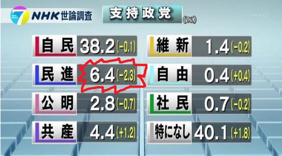 そして、韓国人がいう良心的日本人に当てはまる民進党は、、、6.4%です。