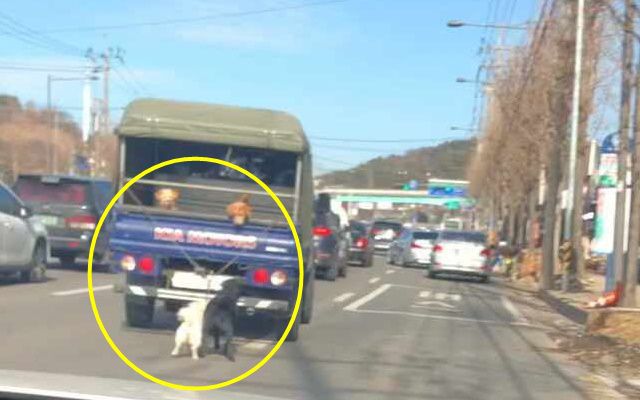 영상에는 목줄을 찬 강아지 2마리가 트럭 뒤편에 매달린 모습이 담겼다. 트럭은 대기 신호가 바뀌자 차선을 바꾸며 점차 속도를 냈고 강아지들은 속도를 이기지 못하고 넘어지기도 했다. 강아지들은 뒤집혀진 채로 질질 끌려갔다.