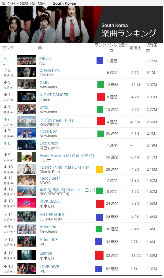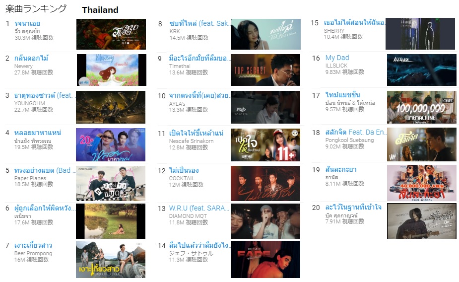 韓国だけ、無茶苦茶外国要素が多いんだな。日本語歌唱曲が上位20位以内に4曲もある。外国人メンバー入りグループの曲が9曲で、韓国人だけの韓国語歌唱の曲は20位までで6曲だけ。日本の場合は17曲、タイだと全曲。