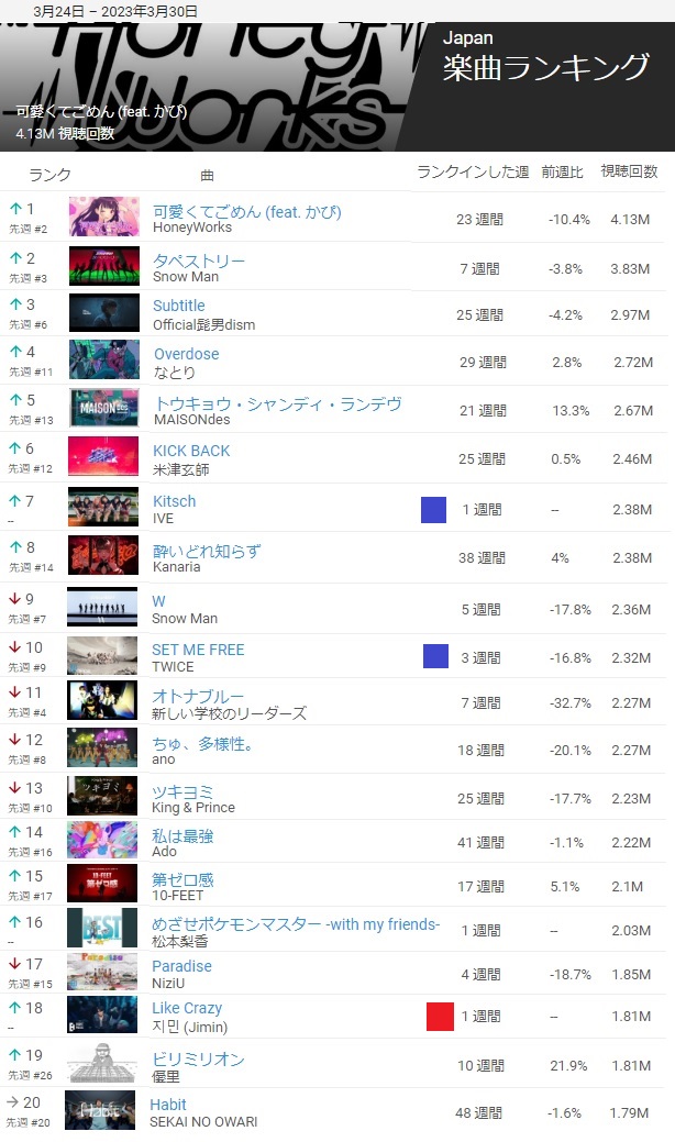 Youtube music charts の楽曲ランキング観たら、こんなんなってた。(上位20曲)