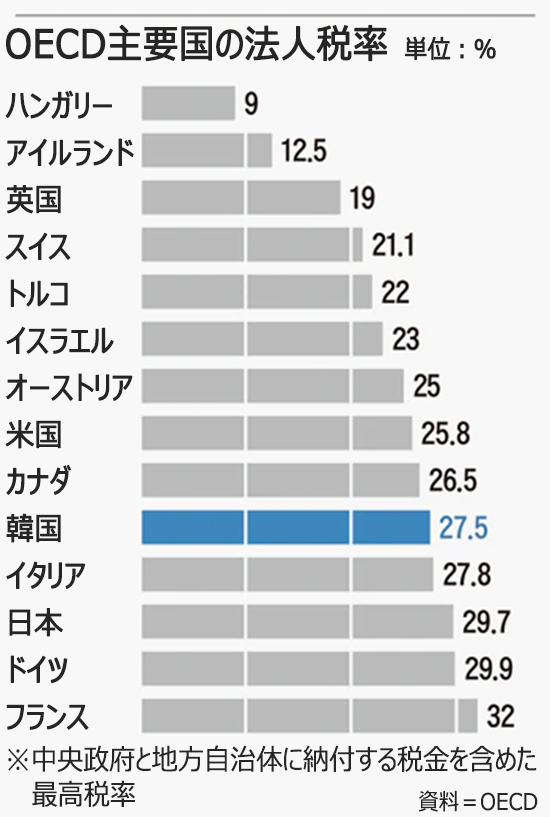 税金全体に法人税が占める割合も世界的に見ると高い方だ。国会予算政策処によると、OECD加盟国の租税総額に占める法人税の割合(2018年基準)は平均8.8%だが、韓国は15.7%に達する。「法人税への依存度が高すぎて、企業の投資意欲を減退させる要因として作用する可能性がある」との指摘も出ているため、与党の大統領選候補者たちも一斉に法人税引き下げに言及している。