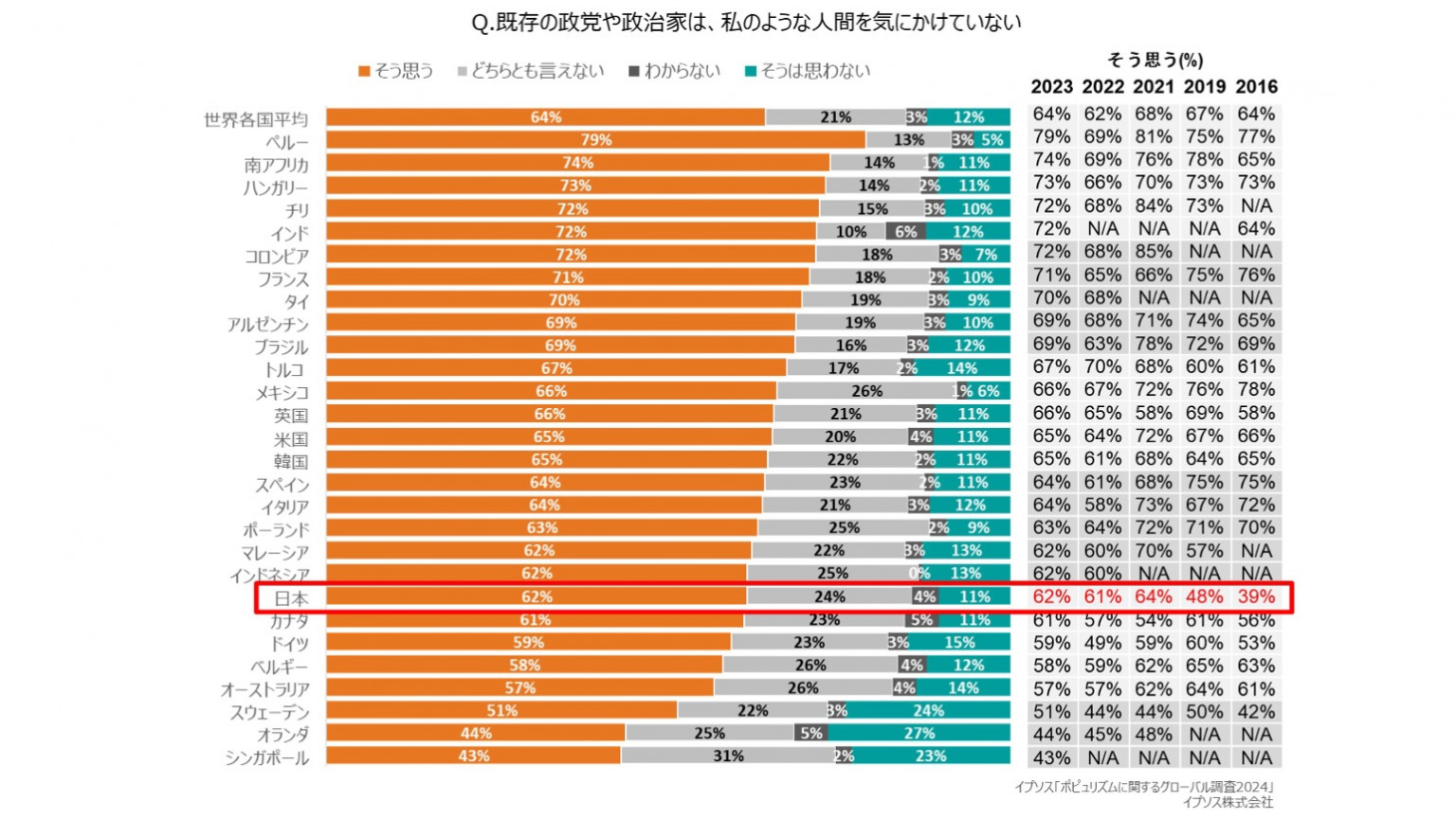でも、産業サプライチェーンはは中韓排除で株価最高。w世界最大規模の世論調査会社であるイプソスは、日本を含む世界28か国2万630人を対象に「ポピュリズムに関するグローバル調査2024」を実施。