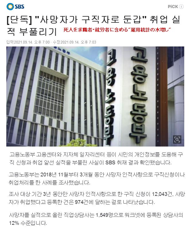 何が本当なんだ?韓国に本当のことなんてないのか、全部嘘か?韓国政府統計 死人を雇用・就職した事にして"雇用統計"を水増し操作 2021/09/14