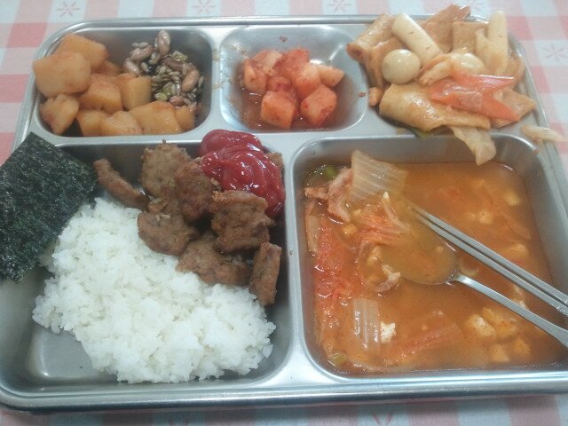 公開された写真には、ご飯とキムチ、エゴマの葉、汁物などが盛り付けられた給食トレイの様子が写されていた。ご飯の量は多いほうだが汁物には具がほとんどなかった。キムチとエゴマの葉は少量で、一番大きなおかずが入るべき空間には何も盛り付けられていなかった。
