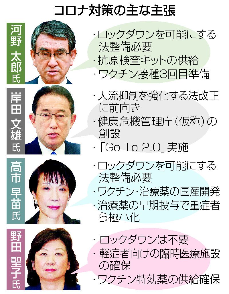 自民党総裁選では、新型コロナウイルス対策をどう進めていくのかが争点の一つだ。4候補ともワクチン接種や医療提供体制の確保を重視する姿勢を示すが、外出禁止などロックダウン(都市封鎖)を可能にする法整備の検討をめぐっては温度差もある。一方、感染収束後に政府肝煎りの経済下支え策「Go To」キャンペーンを再開する方針では足並みをそろえた。
