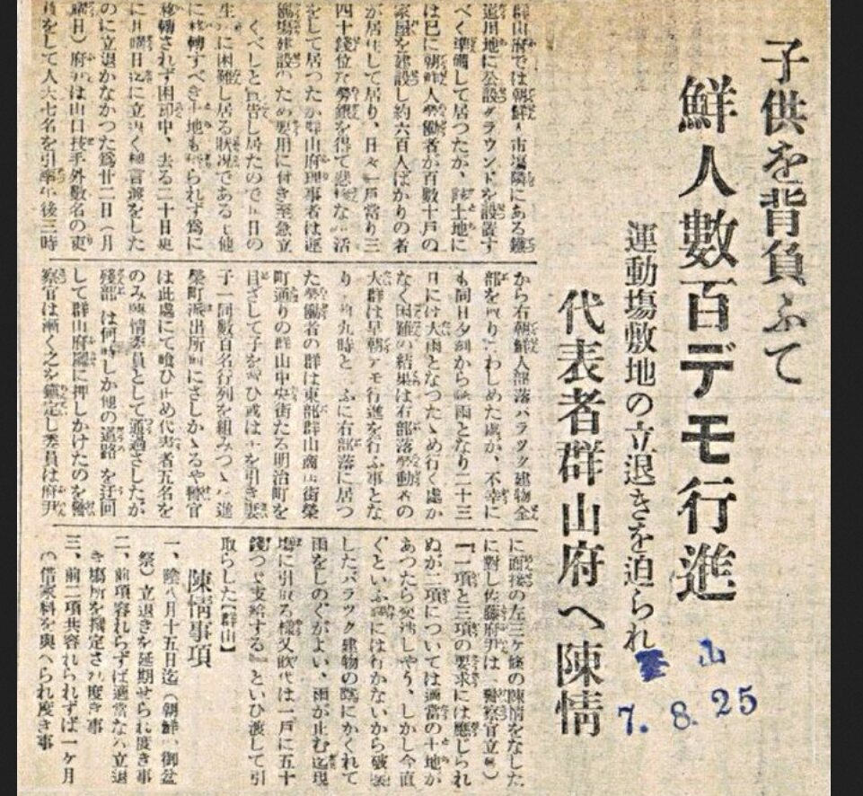 朝鮮で、鉄道用地に勝手に建物を建てて住み着いた朝鮮人に対して、再三立ち退きを指示しても立ち退かず、公設運動場を建設するために強制執行したところ、デモ隊を結成し群山府庁に押し掛けて立ち退き料などを要求したという記事。