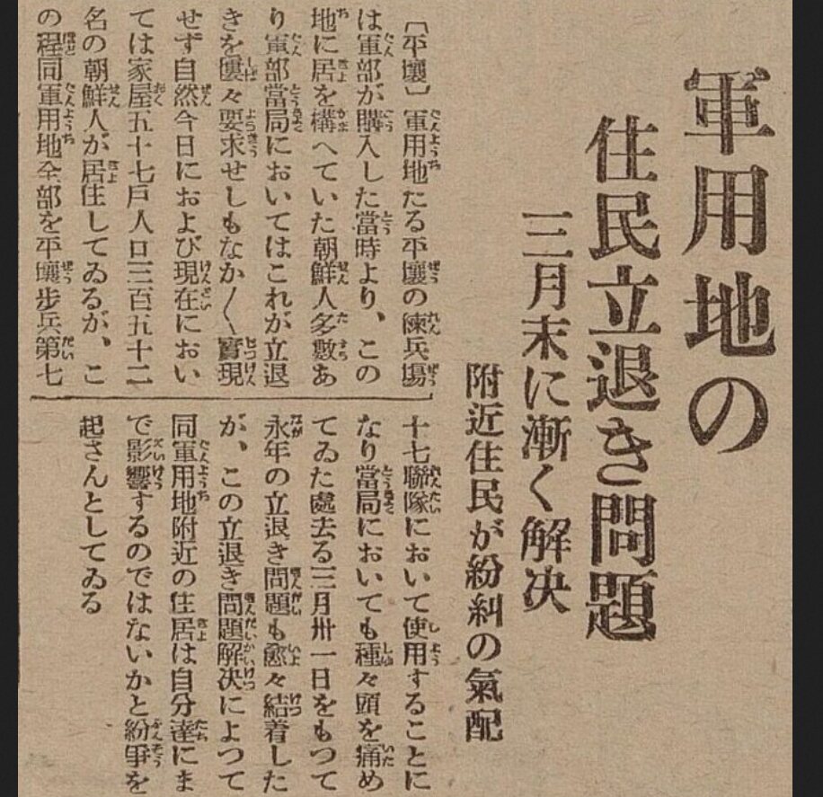 朝鮮で、軍部が事前に購入しておいた土地に住み着いていた朝鮮人が、再三の立ち退き要求を拒み続け、長年の交渉の末にようやく決着したという報道。