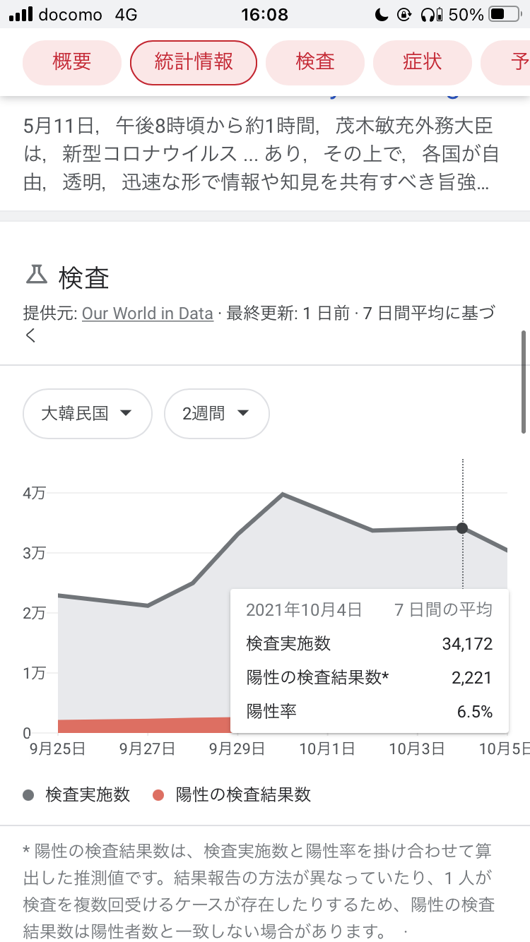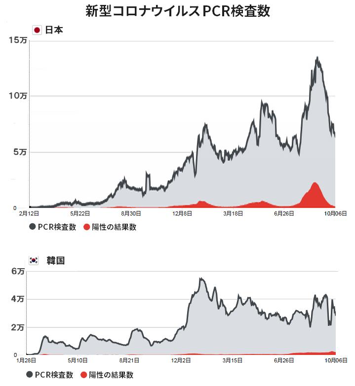 日本の10/7の検査数68,047人に対し、韓国の今週の一日当たり平均検査数は34,172人です。