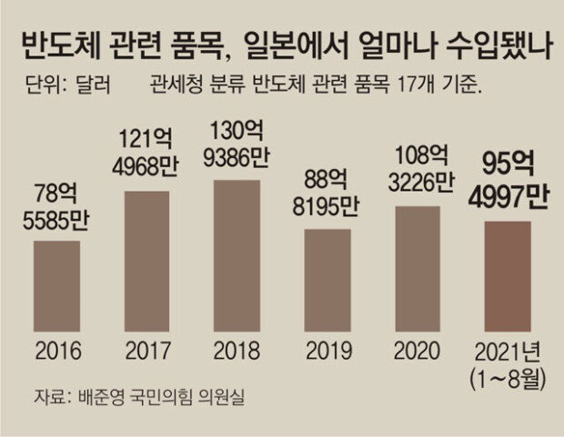3日、最大野党「国民の力」の裵俊英(ペ・ジュンヨン)議員室が関税庁から受けた「対日本半導体関連輸入現状」によると、昨年、日本産半導体関連17品目の素材・部品・装備(素部装)の輸入額は108億3226万ドルで、前年(88億8195万ドル)比約22%(19億5031万ドル)伸びた。