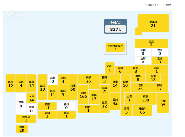 検査件数は8月中旬に一日感染者が2万人まで報告されていた当時、一日17万件まで増えて、最近では週末を除くと3万~6万件程度だ。減ったのは間違いないが、東京の場合は8月中旬24%まで上昇していた陽性判定率が10月5日には1.8%になった。「検査をしないから感染者も減った」というには検査に対する感染率が減りすぎている。