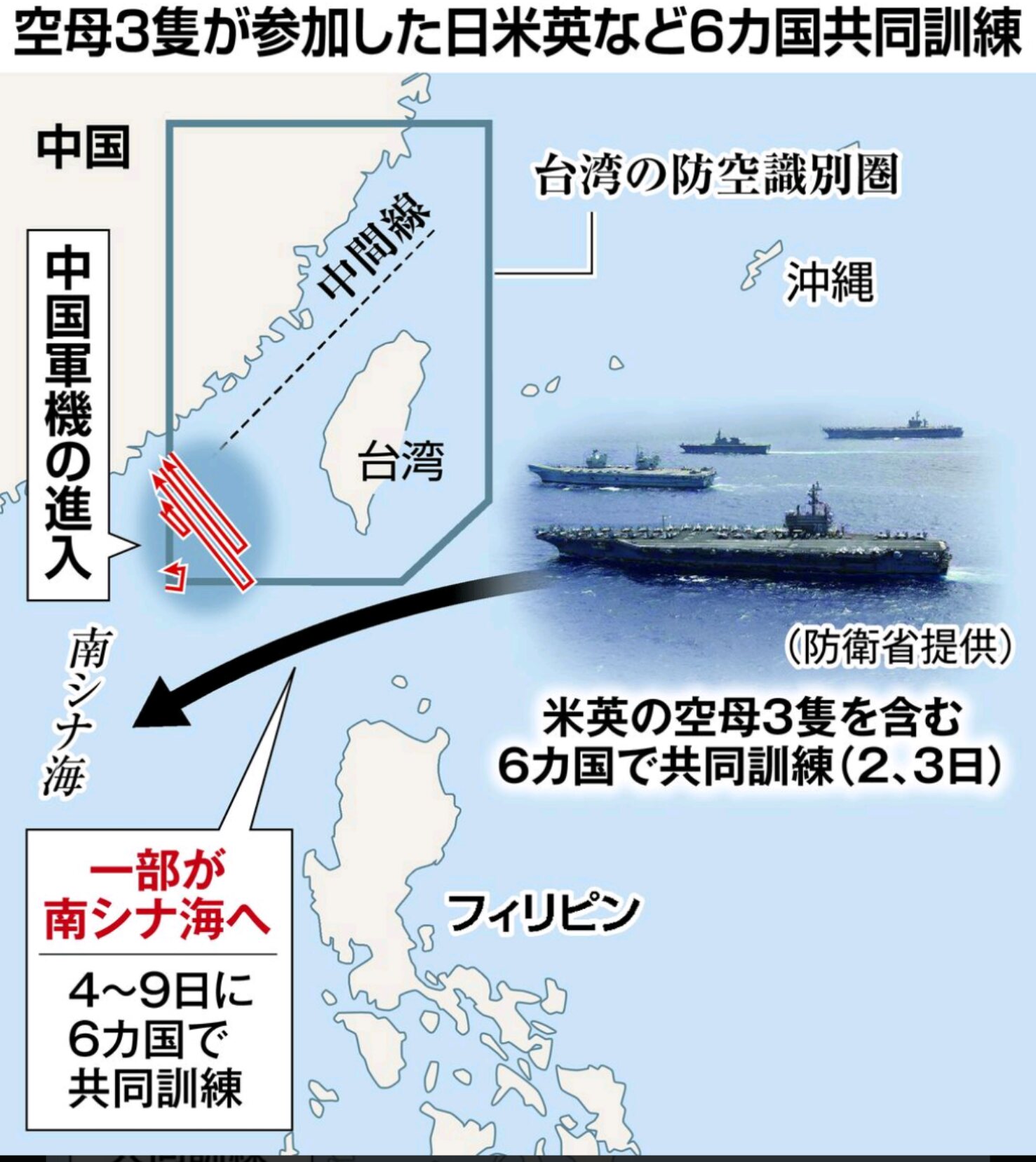 日米英など6カ国の艦艇が南シナ海で行っていた共同訓練が9日、終了した。2、3日には、沖縄南西の海空域で米英軍の空母3隻が参加する訓練も実施した。これに対し、中国は1日以降、戦闘機など延べ150機を台湾の防空識別圏(ADIZ)に進入させ、威嚇を繰り返した。空母3隻が集結する異例の展開に中国側が激しく反応したとの見方が広がっている。