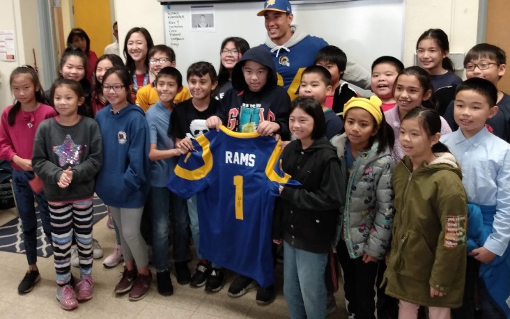 1)中国人とカナダ人のハーフで、現在NFLのロサンゼルス・ラムズで活躍している Taylor Rapp 選手が、ロサンゼルス市内の中国人が多い小学校で小学生に囲まれている所