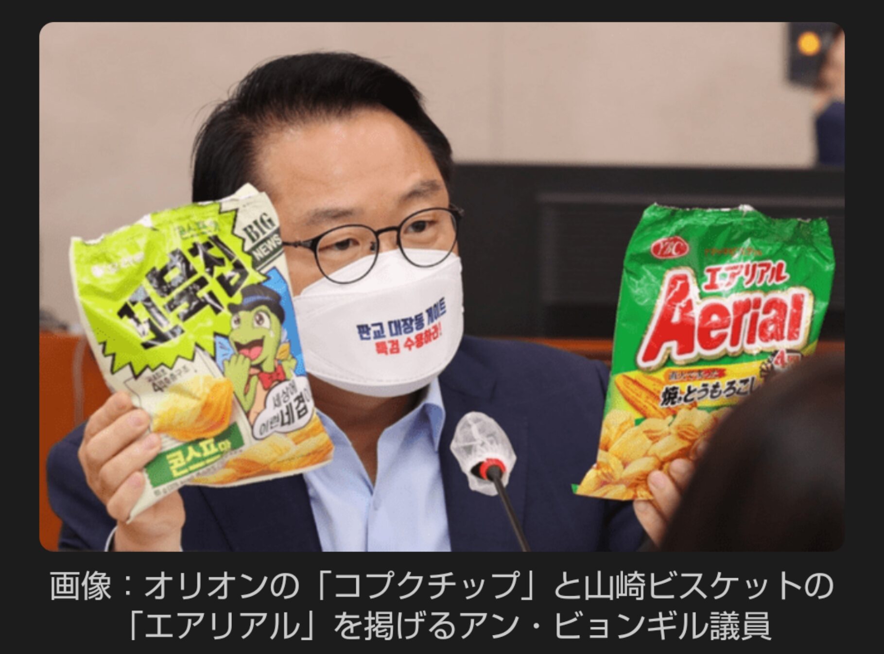 安議員は、韓国の菓子メーカー「オリオン」が2017年に発売した商品「コブクチップ」について「(オリオンは)発売当初『開発に8年かかった』と明らかにしたが、消費者の多くが見た目だけでなく味もヤマザキビスケットの商品『エアリアル』に酷似していると評価している」と指摘した。オリオンが開発を始めたとする8年前の2009年は、ヤマザキビスケットがエアリアルを発売した年だという。