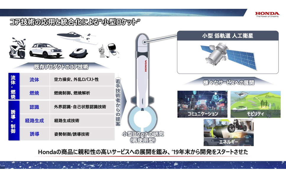 「宇宙」に向けては2019年末から小型ロケットの開発を始めている。温暖化が進む地球環境の観測、自動車のコネクテッド技術向け広域通信など、宇宙利用に必要な小型人工衛星を打ち上げるためのロケットだ。ここでは燃焼技術、ジェット機や自動車での流体技術、自動運転での制御技術などを応用する。