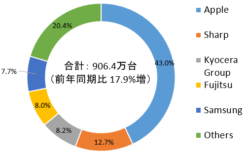 (日本では、発火するGalaxyですら7.7%売れています。円グラフは2021年第2四半期 携帯電話出荷台数)