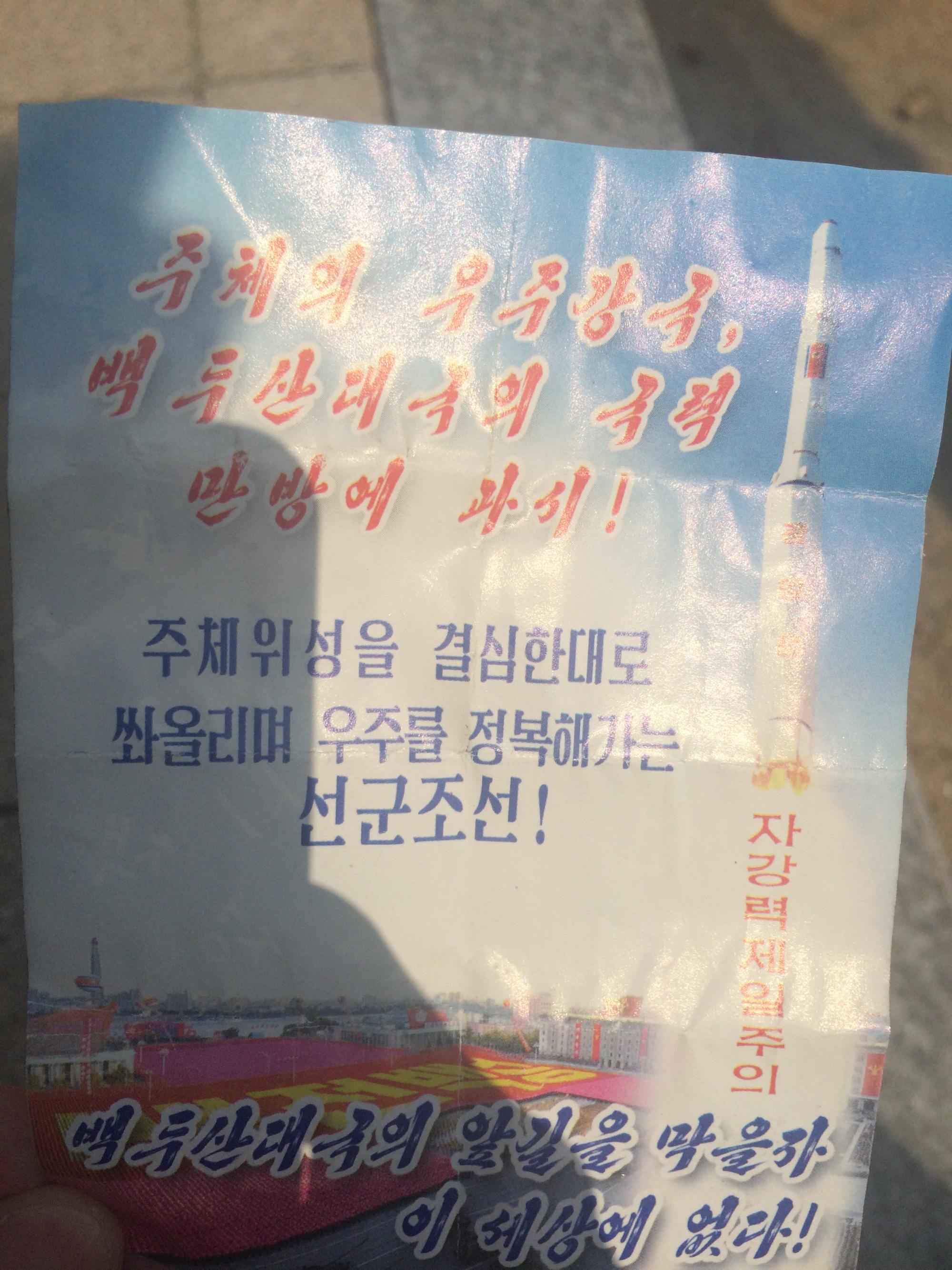로켓 아래에 써진 글씨 : 자강력 제일주의.참고로 '자강력'은 自强力.