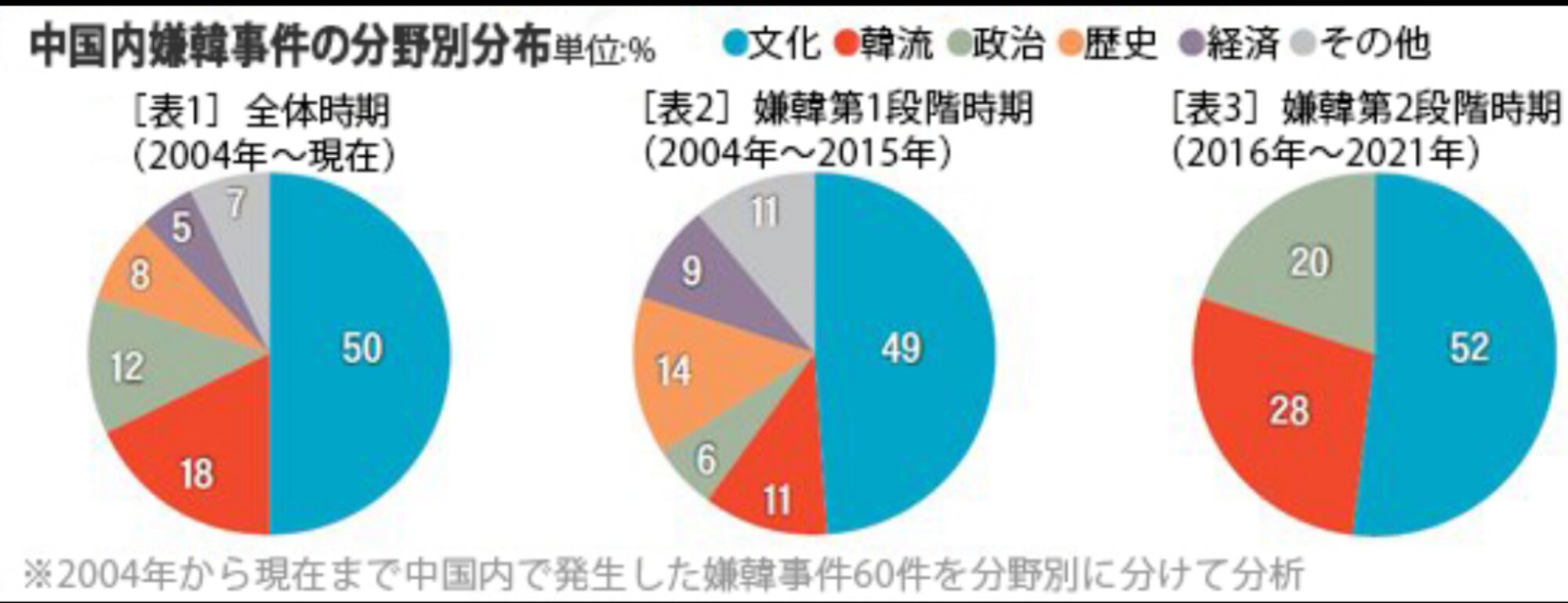 [表2]と[表3]を見ると嫌韓第1段階ではさまざまな分野が嫌韓の対象だが、第2段階では文化と韓流が絶対的な比率を占めている。韓流も文化の一部という側面で見ると、嫌韓の主要対象が文化であることがわかる。中国の伝播工程は世界が対象だ。ところが特に韓国に対して文化攻撃が多い理由は何か。